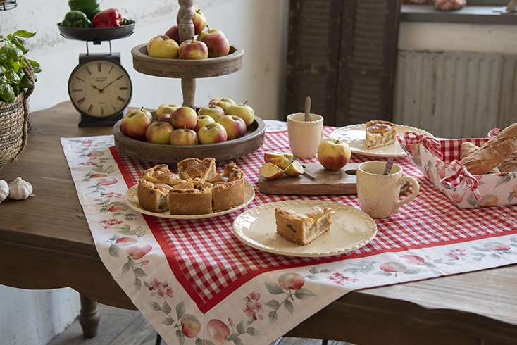 Textilní série Apple Yard vnese do kuchyně barvy zralých jablek a pohodu venkovské zahrady. Jemné akvarelové jablíčko v kombinaci s červenobílou kostkou a krásně zpracovanými okraji působí svěže, hravě a zároveň velmi domácky. Ideální pro všechny, kdo milují pečení štrúdlů, jablečných koláčů a rodinné snídaně u jednoho stolu. Zástěra, utěrky, chňapka, podložka, ubrusy a běhouny tvoří krásný základ pro každodenní stolování i víkendové pohoštění.