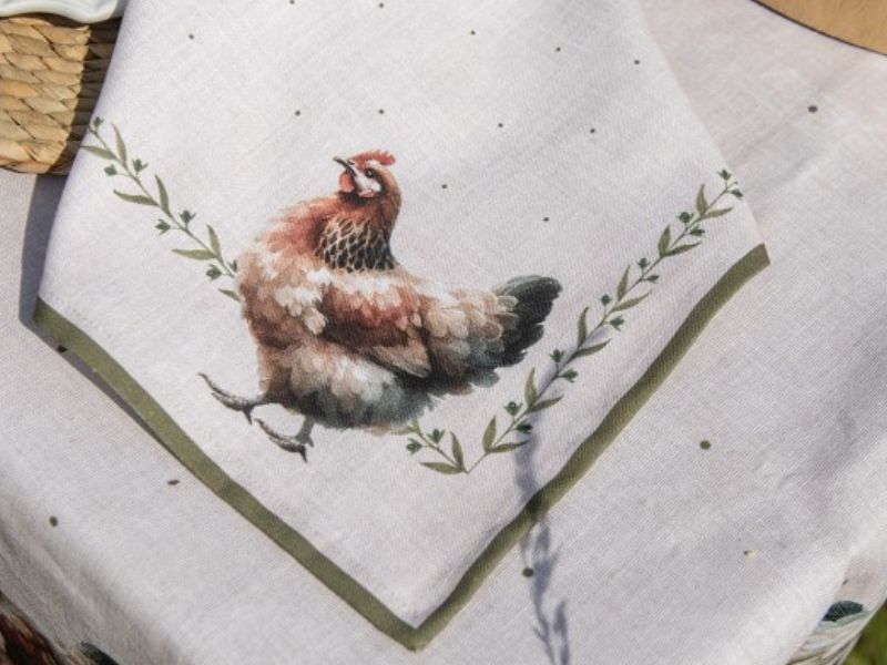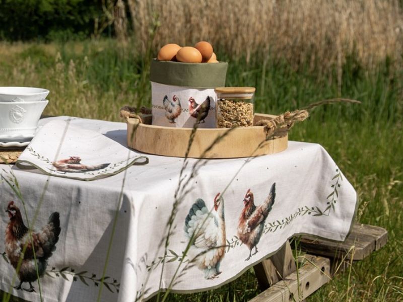 Textilní série Barnyard Chicken přinese do kuchyně atmosféru farmářské snídaně. Akvarelové slepičky v přírodních tónech spolu s jemným venkovským stylem působí hřejivě a domácky. Ubrusy a běhouny, košíky na pečivo, prostírání, utěrky, chňapky i podložky pod hrnce se postarají o sladěný vzhled stolu i pracovní plochy. Stačí přidat čerstvá vajíčka, dřevěné prkénko a keramické nádobí a vznikne útulný kout, který si zamilujete vy i vaši hosté.
