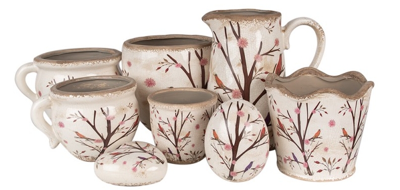 Keramická série Birds in Nature od Clayre & Eef přináší do interiéru klid a půvab přírody. Na jemně krémovém podkladu se rozvíjejí motivy větviček, květů a drobných ptáčků v růžových a přírodních tónech. Lehce patinovaný povrch působí, jako by byl nádobí oblíbeným kouskem už po generace, a dodává mu rustikální, vintage charakter. V kolekci najdete květináče, džbány, dózy i dekorativní vajíčka, která se skvěle hodí na jarní a celoroční aranžmá. Birds in Nature krásně doplní venkovskou kuchyni, jídelnu i obývací pokoj a vytvoří doma atmosféru útulné zahrady plné zpěvu ptáků.