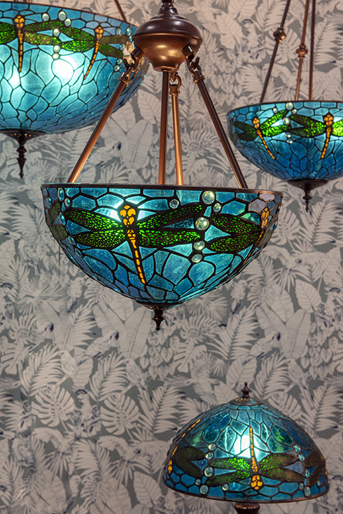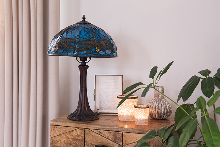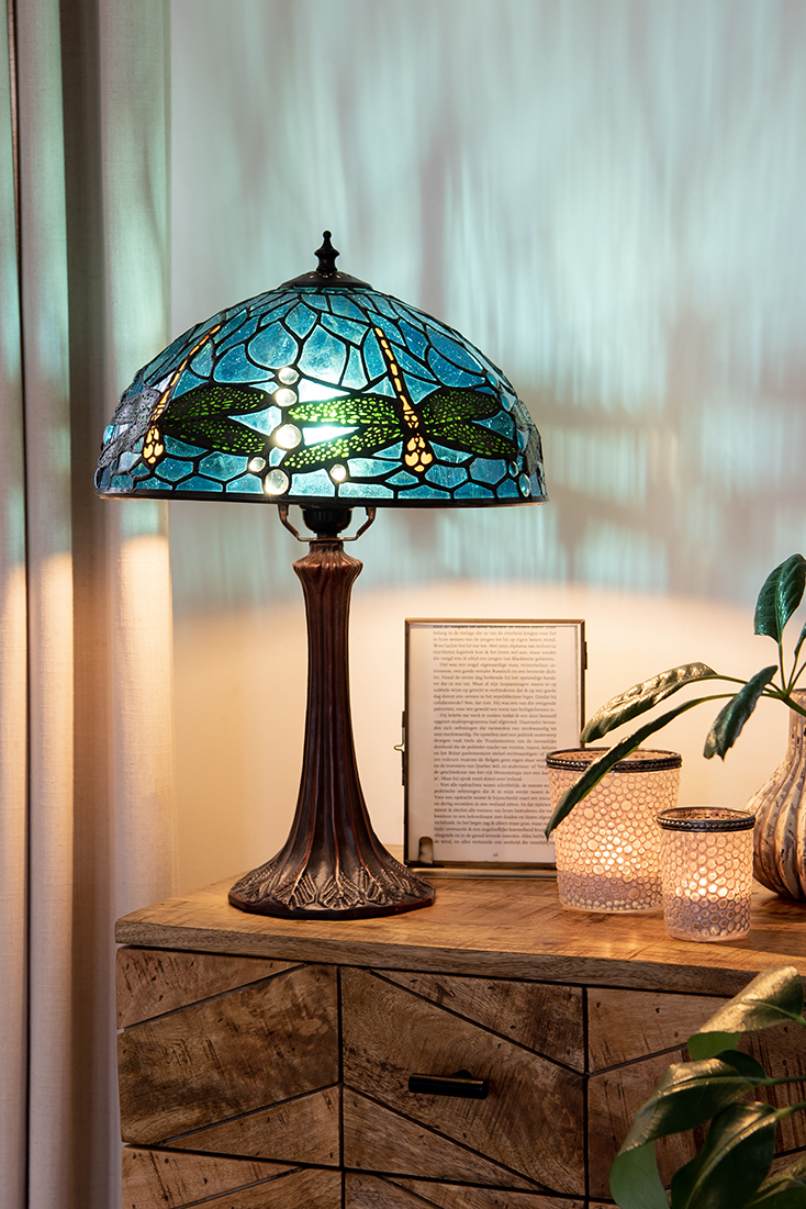 Série Tiffany lamp Blue Dragonfly je nepřehlédnutelná – tyrkysové vitrážové stínidlo připomíná hladinu jezera a výrazná vážka v zeleno-zlatých tónech dodává svítidlům kouzlo i šmrnc. Po rozsvícení se sklo krásně rozzáří a vytvoří útulnou atmosféru s jemnými odlesky, které okamžitě zaujmou. V kolekci najdete stolní lampy i závěsná svítidla, ideální do obývacího pokoje, pracovny i jídelny. Blue Dragonfly je designový klenot pro všechny, kdo chtějí doma originální světlo s výrazným charakterem.