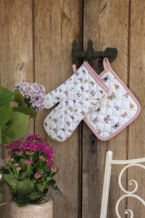 Textilní série Butterfly Paradise vnese do interiéru lehkou letní náladu. Na světlém podkladu poletují barevní motýlci doplnění růžovými akcenty – celek působí jemně, hravě a optimisticky. Ubrusy, běhouny, prostírání, ubrousky a textilní košíky na pečivo promění stůl v místo, kde je radost se sejít. Kuchyňské utěrky, zástěry, chňapky a rukavice jsou k dispozici pro dospělé i děti. V kombinaci s ladícím nádobím vytvoříte útulné prostředí pro rodinné obědy i letní posezení s přáteli.