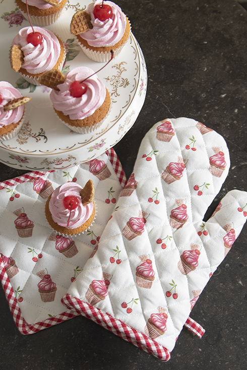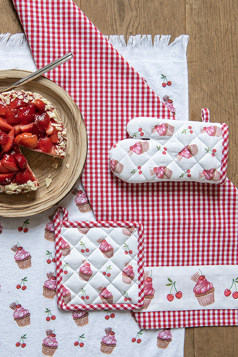 Textilní série Cherry Cupcakes je splněným snem pro všechny milovníky pečení. Veselé ilustrace dortíků a třešní vytvářejí hravou, barevnou atmosféru, která potěší děti i dospělé. Kuchyňské zástěry, utěrky, chňapky a rukavice okamžitě projasní kuchyň a zpříjemní každé vaření i pečení. Na stůl můžete motiv přenést díky ladícímu hrnku, se kterým bude káva i čaj chutnat ještě o něco lépe – protože život je hezčí s „třešničkou na dortu“.