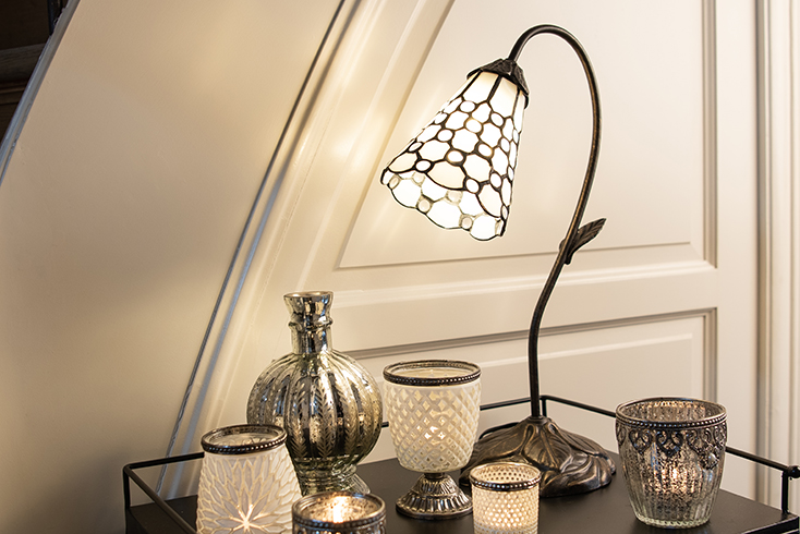 Tiffany lampy z kolekce Dotty White přinášejí do interiéru svěží, současný výraz a jemnou hravost. Stínidla jsou tvořena čistě bílým vitrážovým sklem, které je poskládané do geometrického vzoru s propojenými kruhovými detaily. Výsledkem je moderní, ale zároveň nadčasový design, který se skvěle hodí do minimalistických i elegantních prostor. Dotty White ukazuje, jak může tradiční tiffany technika splynout s aktuálními designovými trendy. Lampy vytvářejí měkké, příjemné světlo a promění obývací pokoj, ložnici či pracovnu v harmonické a stylové místo k odpočinku.
