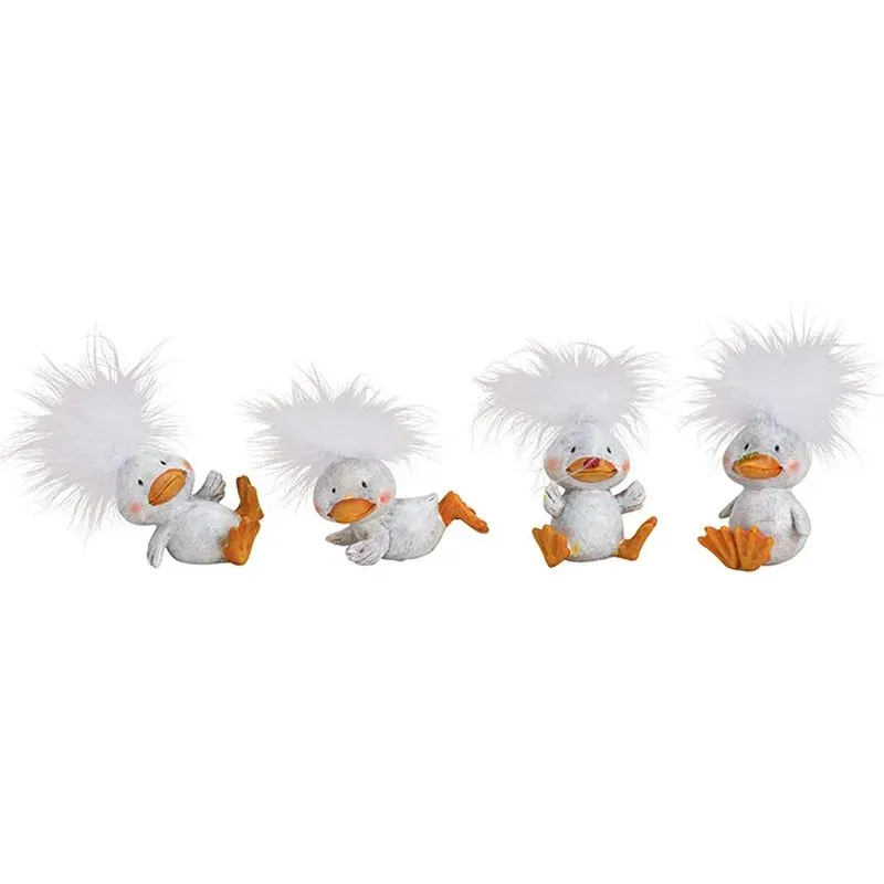 Čtyři milé figurky kachniček s peříčkovými ozdobami. Spolu s ostatními velikonočními dekoracemi krásně ozdobí stůl, okenní parapet.