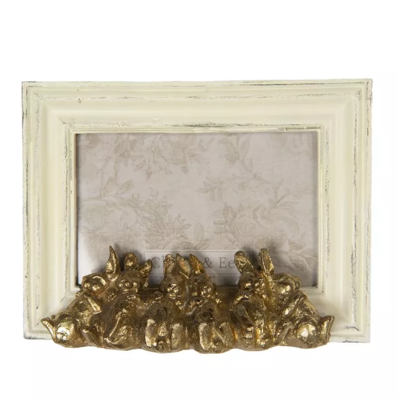 Bílý polyrezinový rámeček na fotografii zdobený zlatými sedícími králíky. Rozměr fotografie 15x10 cm. Mějte ty nejkrásnější vzpomínky stále na očích a dopřejte jim ve svém domově výsostné místo.