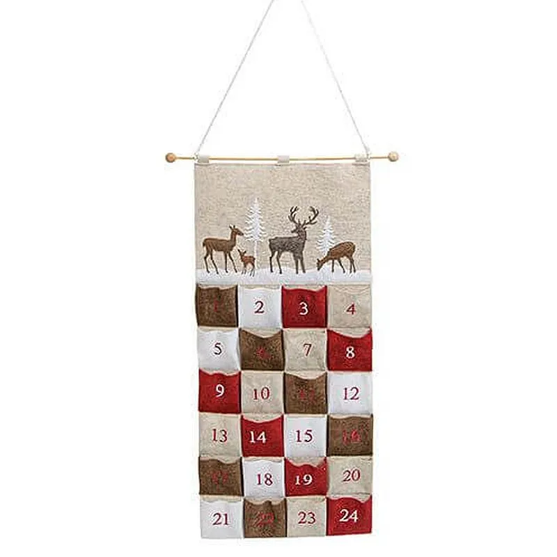 Pěkný adventní kalendář se zimní lesní scenérií k zavěšení na zeď, kde může viset po celé Vánoce jako hezká dekorace.