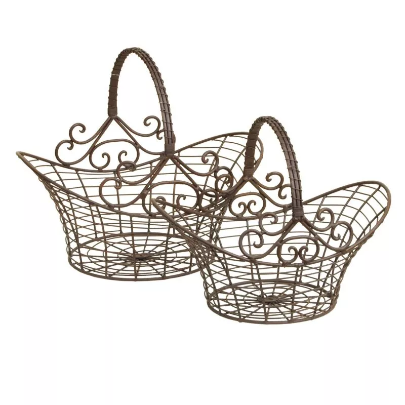 Sada dvou kovových dekorativních košů v rustikálním stylu, ideální na ovoce nebo rostliny.
