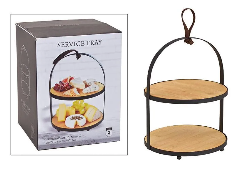 Dvoupatrový kovový podnos s bambusovými poličkami je skvělým doplňkem v kuchyni k servírování sýrů, předkrmů, ale můžete na něj naaranžovat také drobné dekorace.