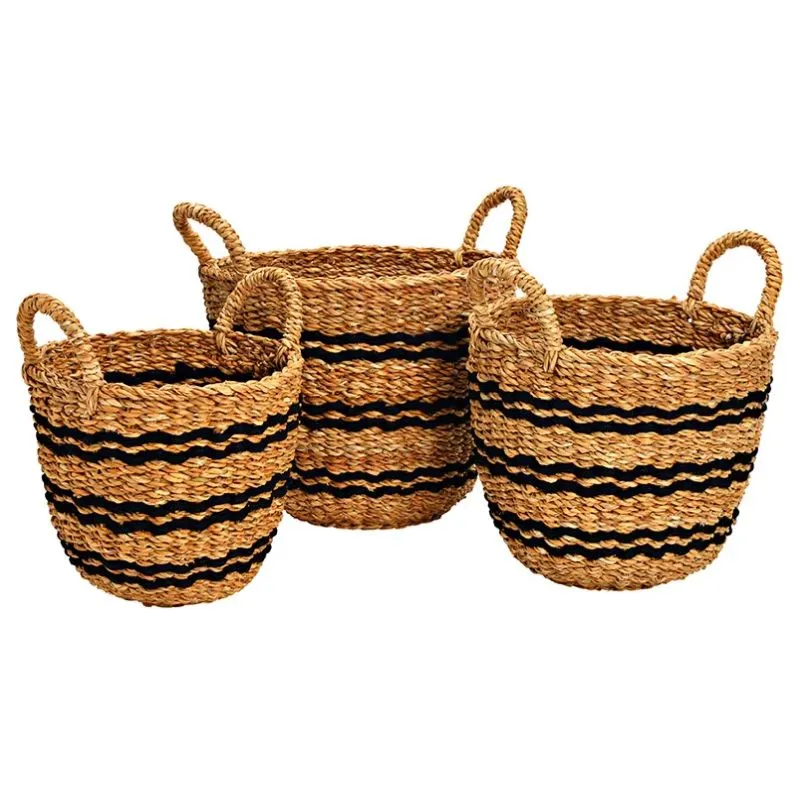 Sada tří přírodních košíků s černými pruhy z mořské trávy a juty, s praktickými uchy. Tyto okouzlující tkané košíky mohou sloužit jako organizéry pro různé předměty v domácnosti nebo obaly na květináče.