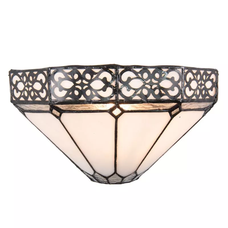 Stylová vitrážová nástěnná lampa TIFFANY z bílého skla. Lampa s ozdobnými pruhy zaujme jedinečným krajkovým vzorem v horní části svítidla. Toto originální osvětlení dodává interiérům jedinečnou atmosféru.