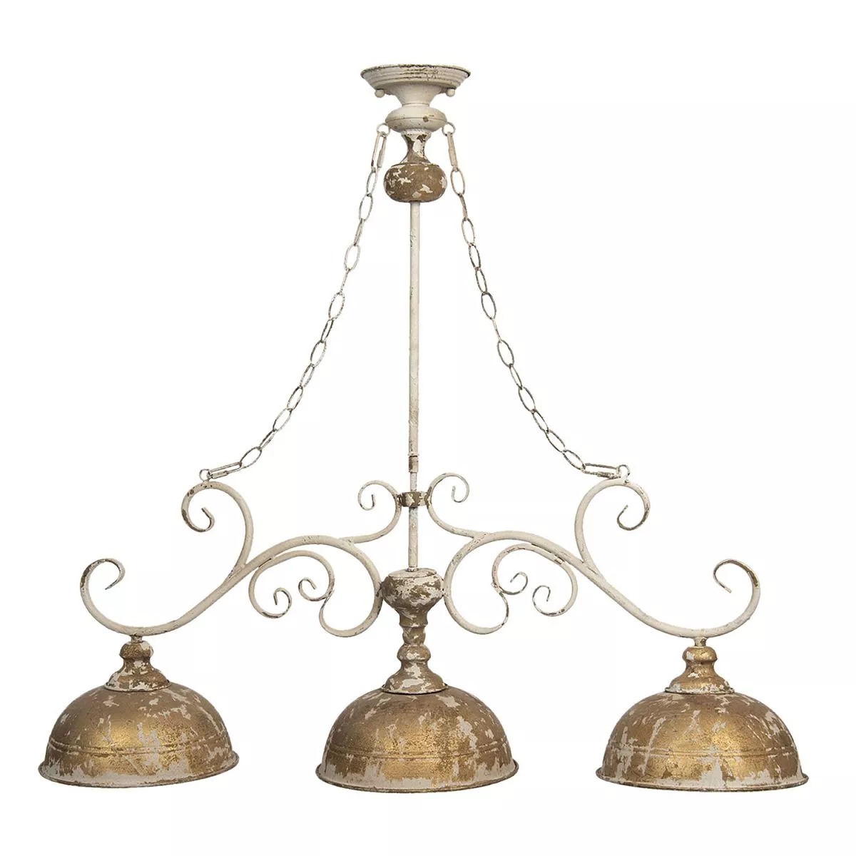 Široký kovový trojitý lustr ve vintage stylu. Lampa vypadá jako starý lustr z minulých let, který ošklivě ohlodal zub času. Lampa kombinuje prvky vintage a loftového stylu. Řídnoucí, jakoby nedbale nanesená barva a odlupování způsobují, že lampa připomíná osvětlení starého domu. Neotřelá povrchová úprava stínidel působí industriálním dojmem, který je zjemněn romantickým povrchem. Tento jedinečný lustr skvěle ozdobí vintage nebo provensálský styl. Doporučujeme pro interiéry s duší a aranžmá inspirované starými časy.