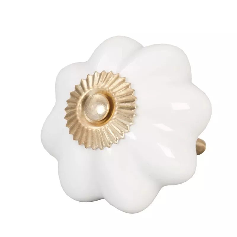 Keramická nábytková úchytka ve tvaru květiny se zlatým středem na dvířka nebo zásuvku, vhodná do jakéhokoliv interiéru. Bílá barva.