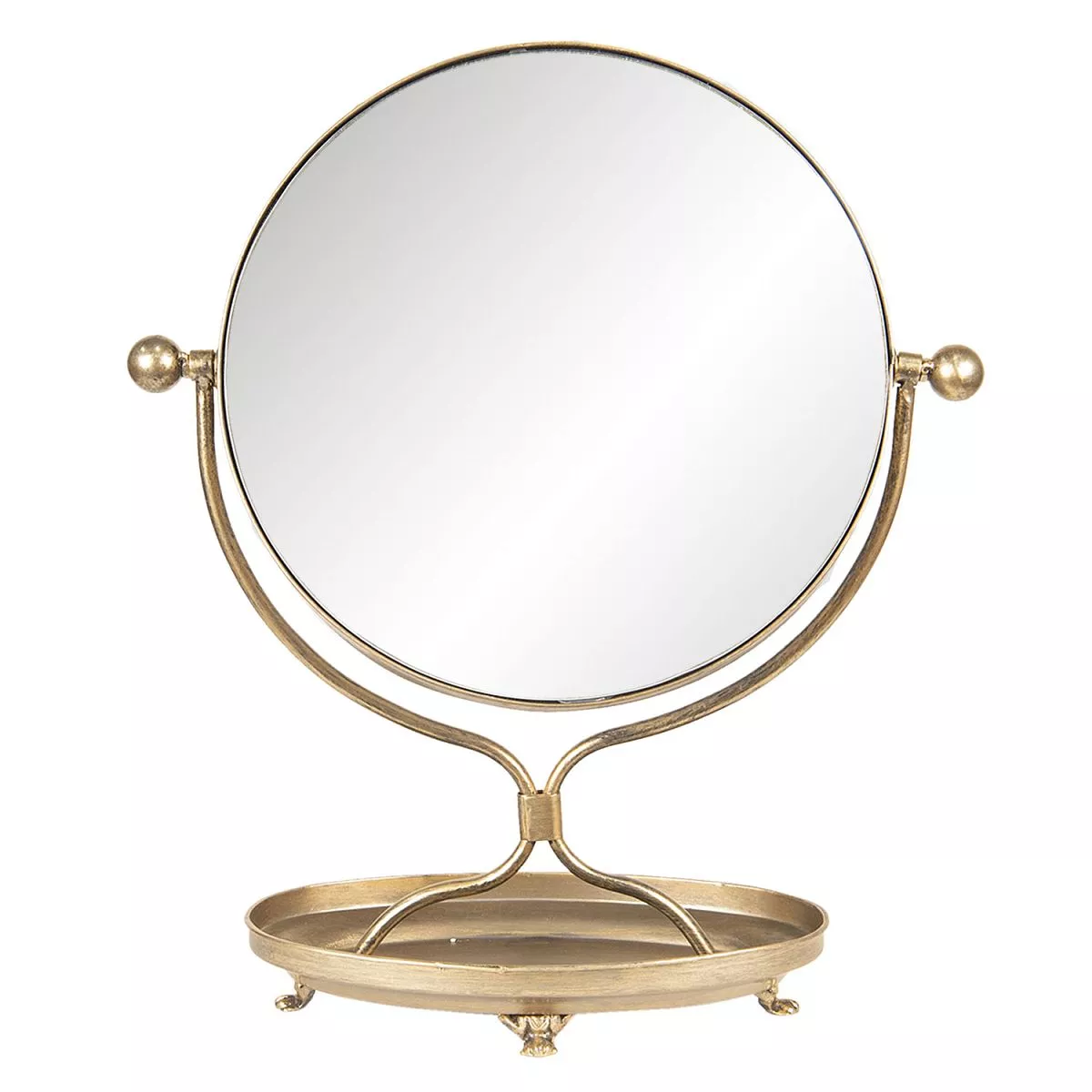 Stolní zrcadlo s nastavitelným sklonem ve zlatém kovovém rámu na kruhovém podstavci, který se hodí na odkládání šperků, vlasových doplňků nebo dekorativních předmětů. Zrcadlo balancuje mezi retro a industriálním stylem.
