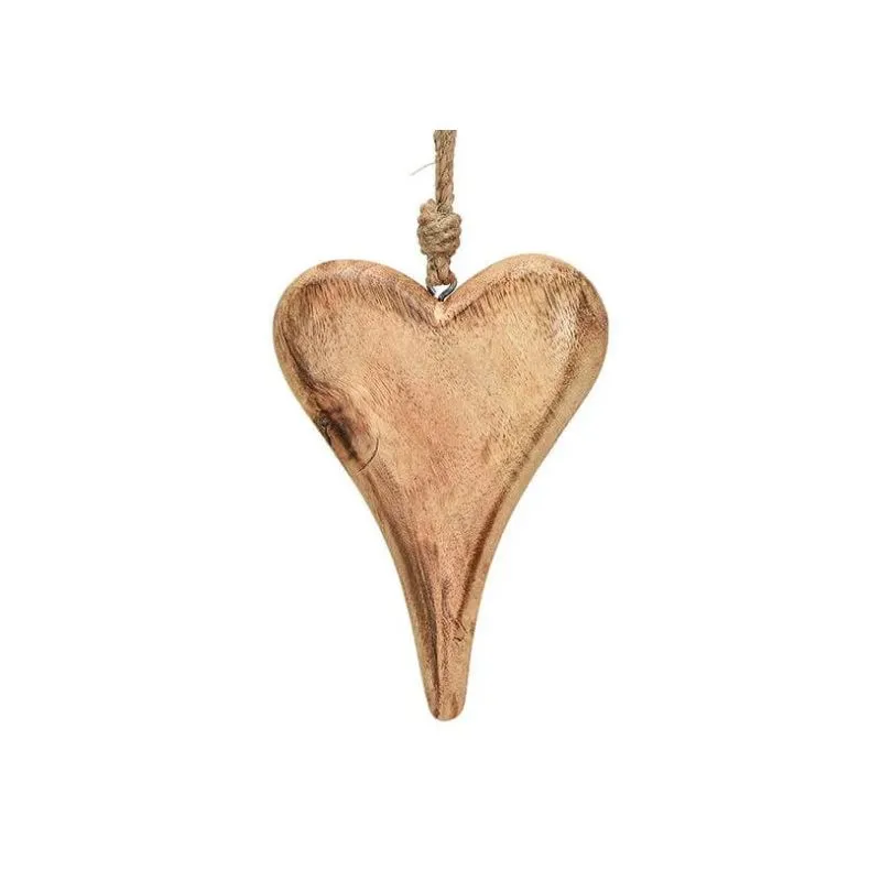 Dekorativní srdce z mangového dřeva v přírodní hnědé barvě s rustikálním vzhledem ve venkovském stylu. Tato krásná závěsná dekorace z přírodního materiálu je vhodná pro každý styl bydlení, hodí se pro každé roční období a vždy přitáhne pozornost.