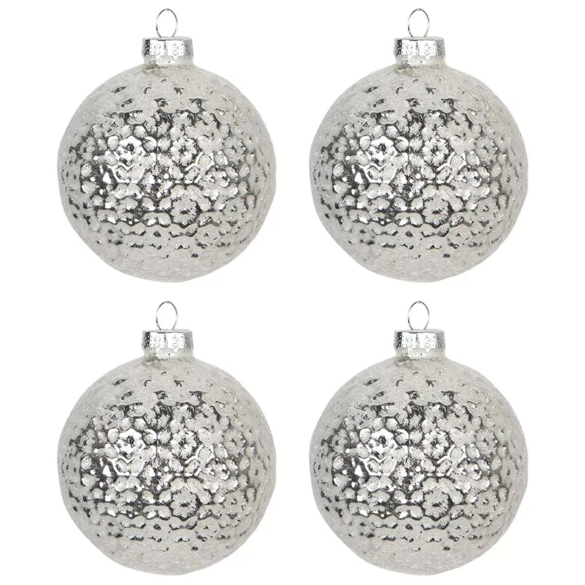 Sada čtyř dekorativních, luxusních skleněných vánočních ozdob v klasickém stylu, ve stříbrné barvě.