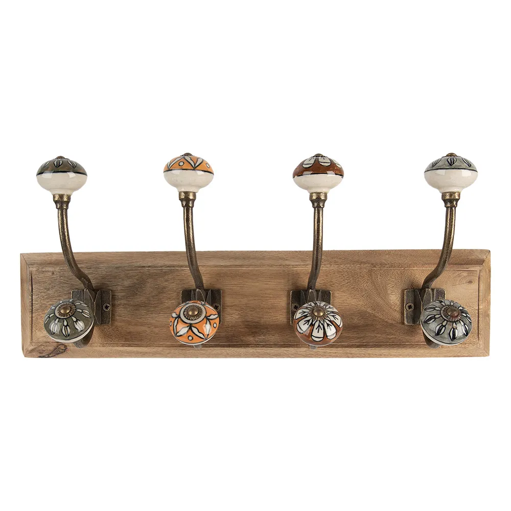 Dekorativní dřevěný nástěnný věšák se čtyřmi kovovými háčky zakončenými krásnými keramickými úchyty. Doporučujeme pro provensálské, vintage, rustikální a venkovské interiéry.