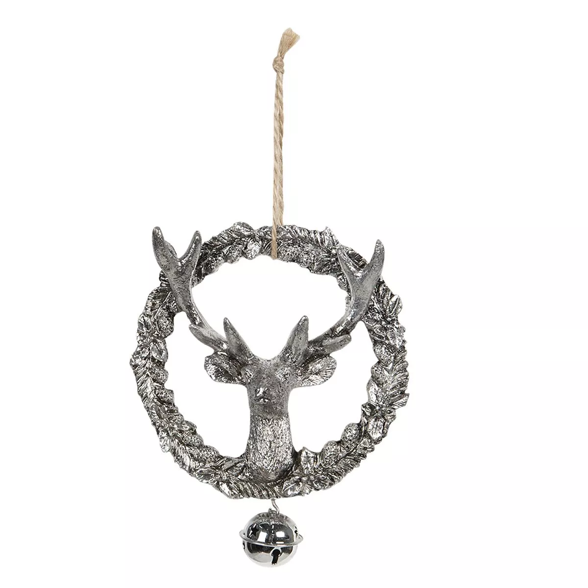 Dekorativní závěsná polyrezinová figurka jelena ve vánočním věnci ve stříbrné barvě. Pověsit si ho můžete na stromeček nebo ozdobit jím vánoční věnec.