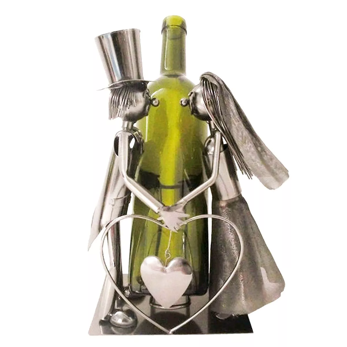 Originální kovový stojan na láhev ve tvaru ženicha a nevěsty promění obyčejnou láhev vína, oleje nebo octa ve stylovou dekoraci s vtipným a romantickým nádechem. Skvěle vynikne na slavnostně prostřeném stole, při letní zahradní párty i jako nápaditý doplněk na svatební hostině. Díky svému hravému designu je také krásným dárkem pro novomanžele, k výročí nebo pro všechny, kteří mají rádi neobvyklé bytové doplňky. Tento stojan potěší nejen praktickým využitím, ale i jako dekorace, která zaujme na první pohled. Poznámka: Láhev není součástí balení.