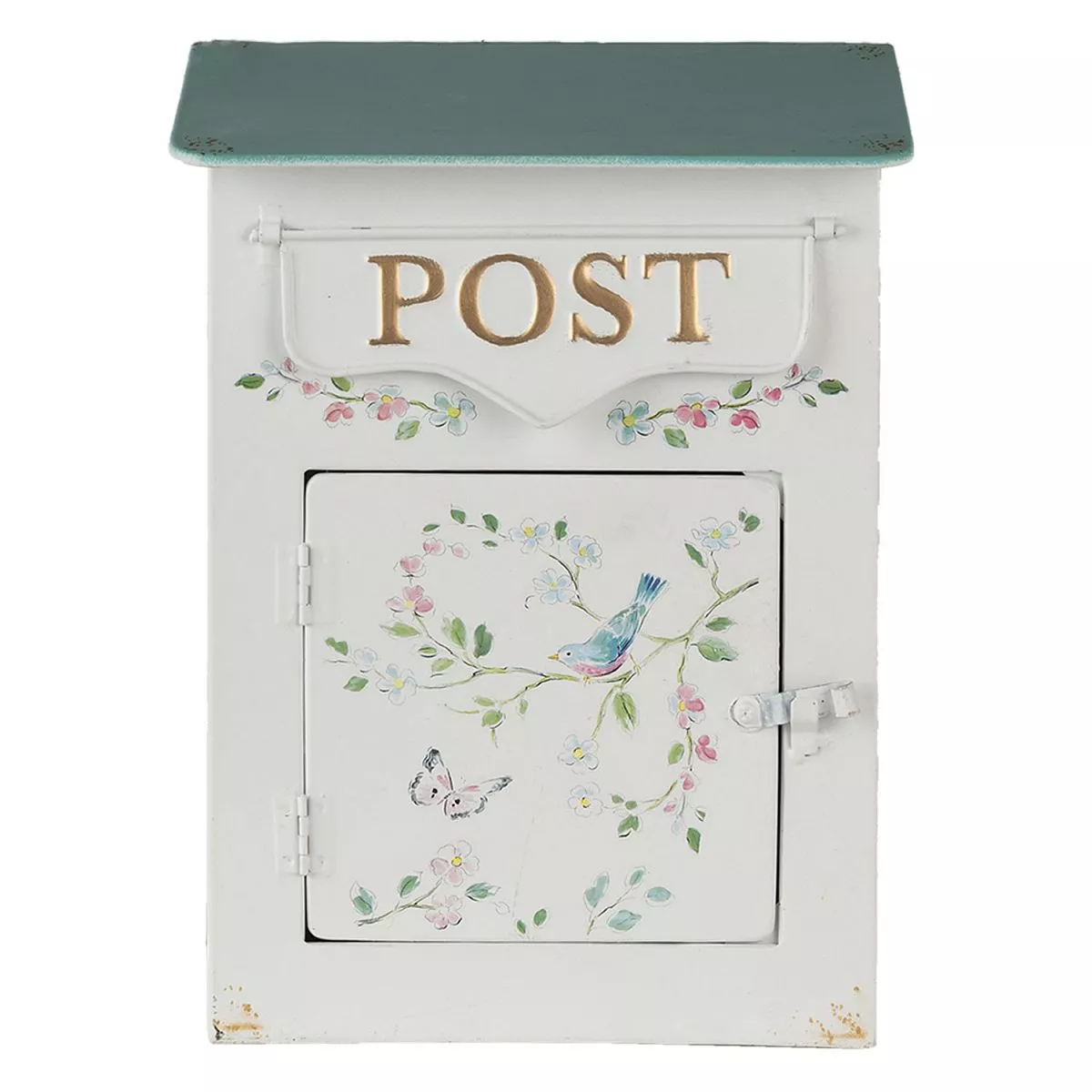 Dekorativní bílá poštovní schránka, vyrobená z kovu a natřená. Schránka je stylizovaná podle modelu ze starých časů. Krásná, romantická přední strana s květinovou výzdobou a vintage nápisem POST jí dodávají šarm a vkus. Hodí se do interiéru na ukládání poznámek a důležitých dokumentů.