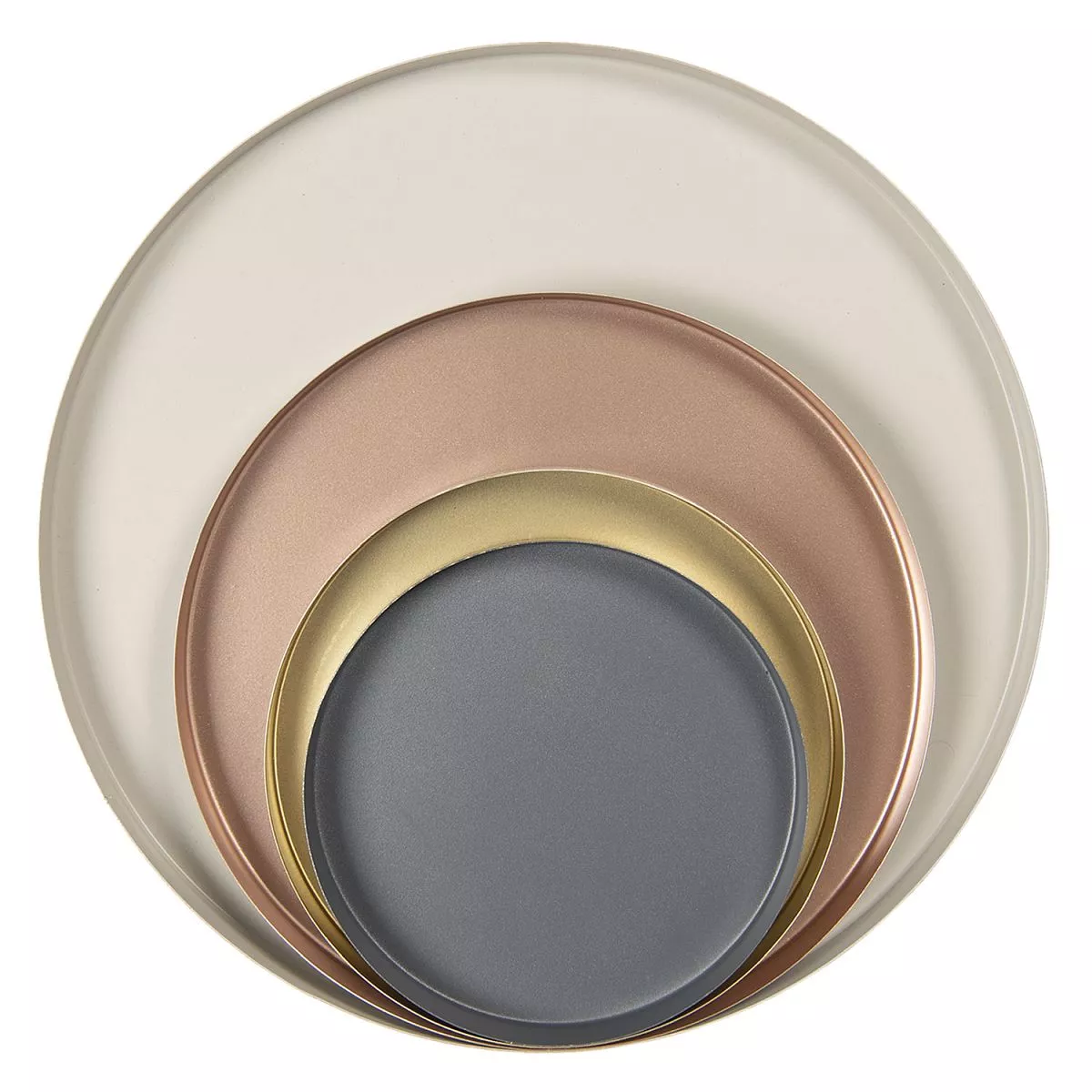 Sada čtyř kovových tácků různých velikostí a barev, v moderním stylu.