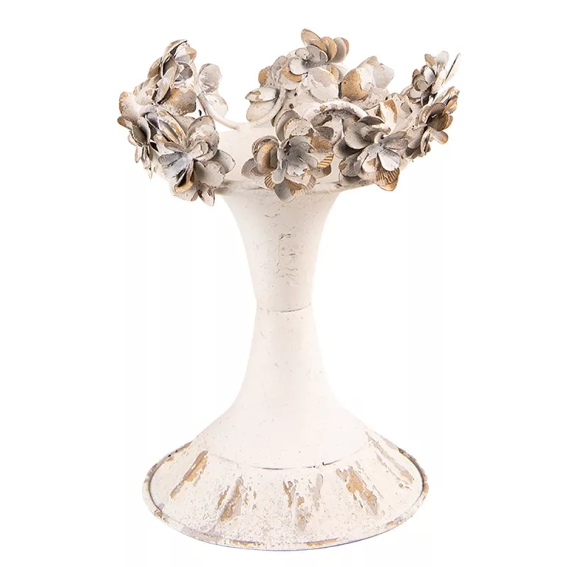 Romantický kovový svícen v rustikálním stylu. Mořeno na starožitný krémový odstín, záměrně narušené, zestárlé, odřené a poškrábané. Svícen na svíčku v širokém válci. Starožitný podstavec a koruna z malých půvabných květů působí stylově a originálně. Doporučujeme kombinovat tento fenomenální svícen s prvky, jako je stará komoda, vintage dřevěný stůl nebo stůl v rustikálním stylu. Najde uplatnění ve venkovském, rustikálním a farmářském stylu.
