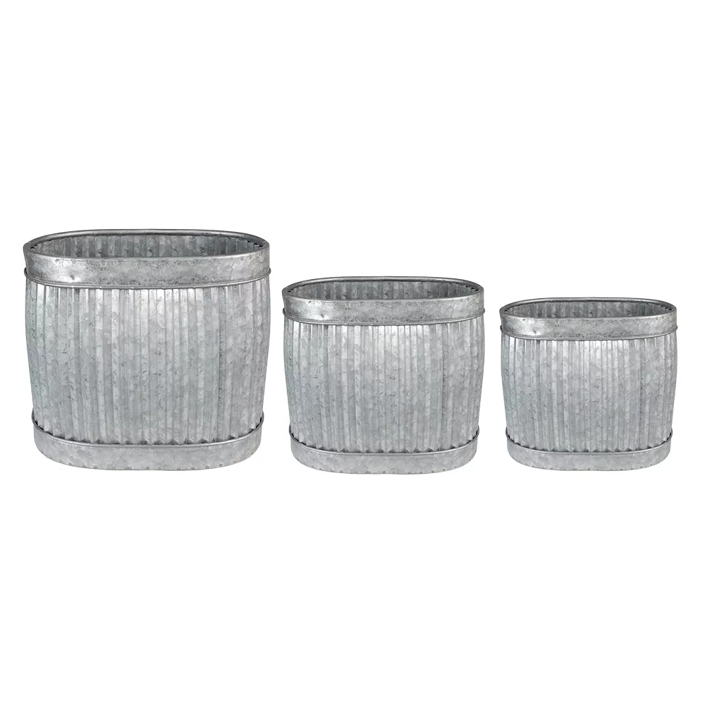 Pěkná dekorativní sada tří šedých kovových obalů na květináč ve venkovském stylu. Nejsou vodotěsné. S touto krásnou sadou květináčů si můžete vytvořit pěkný květinový koutek na zahradě nebo na balkoně nebo je použít samostatně po celé zahradě. Pro prodloužení jejich životnosti doporučujeme umístit květináče pod přístřešek.
