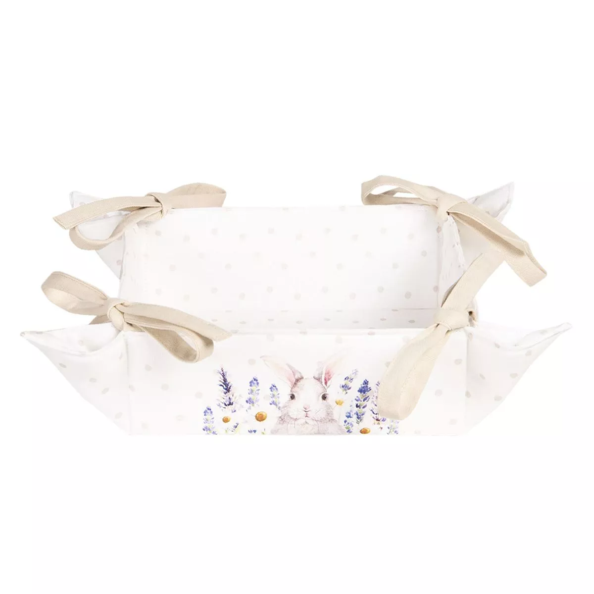 Bavlněný košík na pečivo z textilní kolekce LAVENDER FIELDS. Představte si, že jste ve Francii, kde hojně kvetou levandulová pole. Tato textilní série vás zavede do "la vie belle". Tato řada dokonce nabízí extra variantu pro Velikonoce. Ústřední roli v ní hraje roztomilý králíček, který dotváří velikonoční stůl.