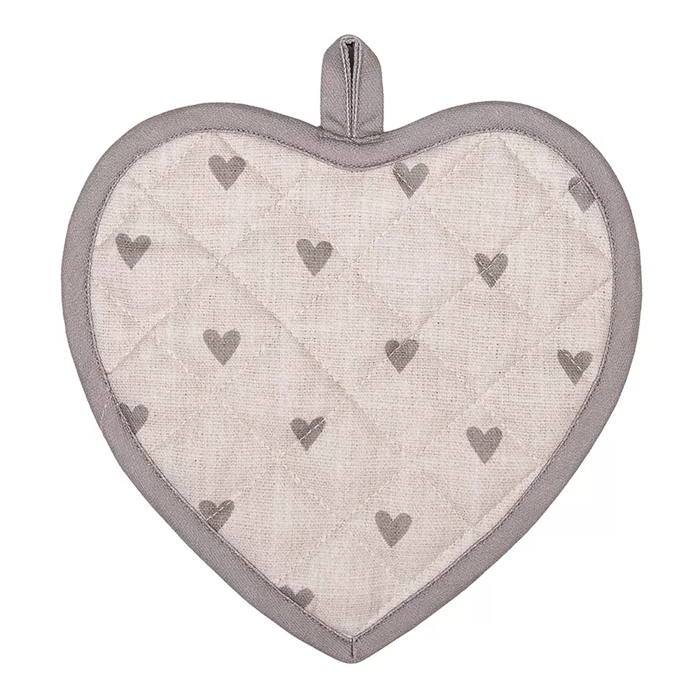 Krásná béžovo-šedá chňapka s motivem srdce. Jedinečný kousek s vlastním designem, který skvěle doplňuje další textilie ze stejné řady LOVE IT. Chňapka je vyrobena ze 100% bavlny a má polyesterovou výplň pro izolaci, díky níž je odolná vůči teplu. A chňapku lze samozřejmě prát v pračce.