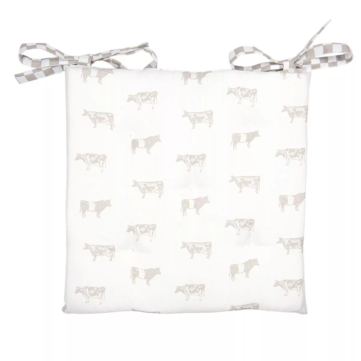 Půvabný bavlněný sedák na židli s výplní s motivem kraviček ve venkovském stylu.