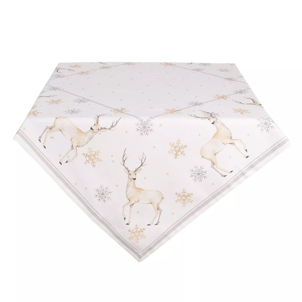 Krásný bavlněný ubrus s vánočním motivem jelena a sněhových vloček z textilní kolekce PASTEL CHRISTMAS. Krásná textilní řada, která je díky svým nádherným vzorům nepostradatelnou součástí vánoční výbavy. Díky barevné paletě v pastelových odstínech lze tuto sérii jemně a krásně kombinovat s mnoha druhy nádobí.