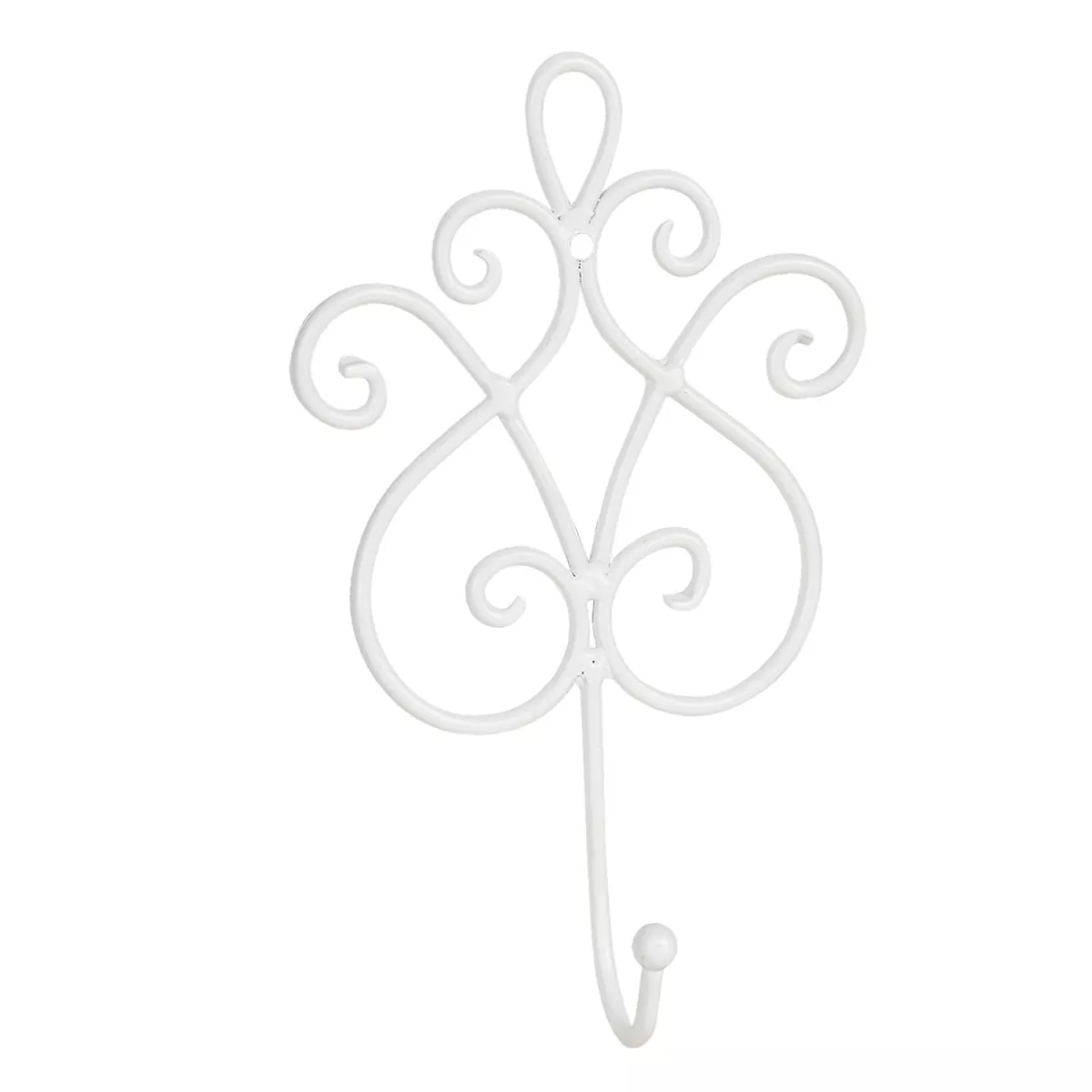 Bílý kovový háček zdobený ornamentem. Hodí se do koupelny jako věšák na ručník či na župan. Vhodný je samozřejmě i do předsíně, kuchyně nebo na zahradu. Perfektní do interiéru laděného ve vesnickém a shaby chic stylu.