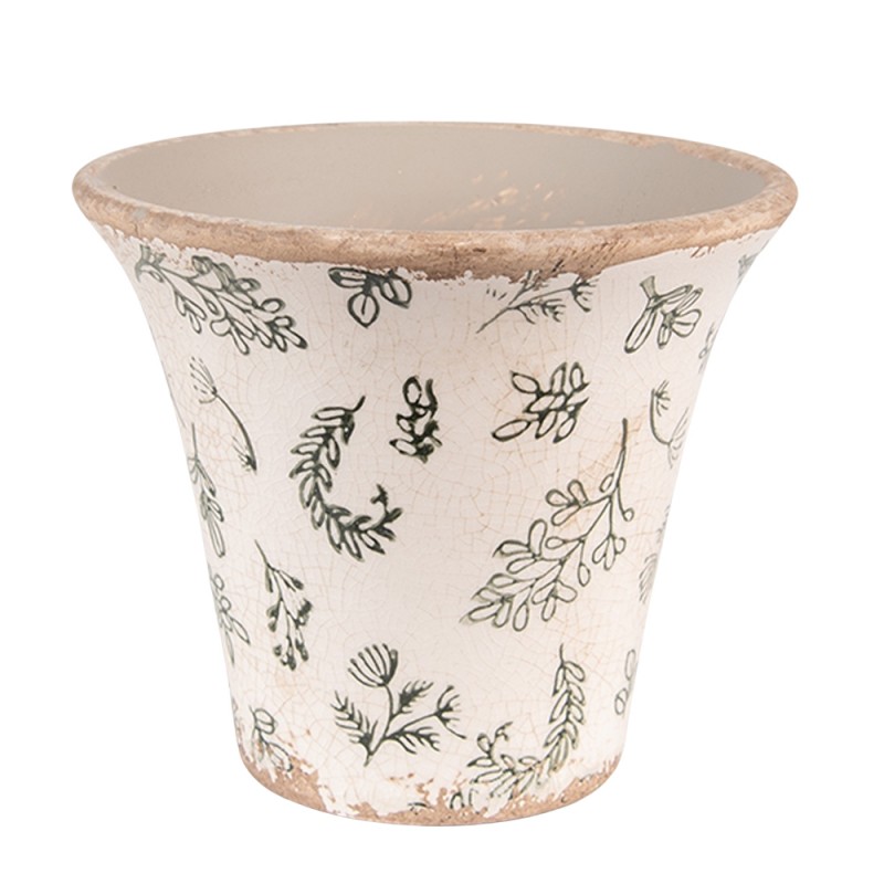 Krásný do interiéru, ale v létě i do exteriéru, dekorativní béžový keramický květináč s motivem zelených květů, ve venkovském stylu. Tento květináč je součástí série DANDELION LEAVES.