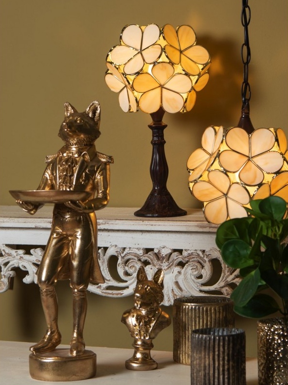 Tiffany série Summer Bloom přináší do interiéru atmosféru letního večera plného květů. Stínidla jsou poskládána z okvětních lístků z opálového skla v teplých zlatavých a meruňkových tónech, které po rozsvícení vytvářejí měkké, příjemné světlo. V kolekci najdete stolní i závěsné lampy, ideální nad jídelní stůl, do obývacího pokoje nebo ložnice. Summer Bloom je výrazná designová ozdoba, která se krásně kombinuje se zlatými doplňky a dodá každému prostoru romantický, ale zároveň hravý charakter.
