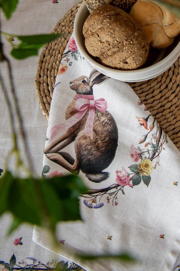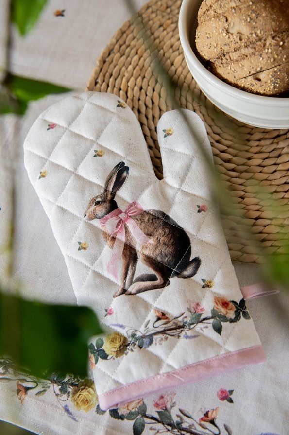 Textilní série Easter Whispers promění vaši kuchyni v jemně jarní zákoutí. Na lněném podkladu se vyjímá roztomilý zajíček s růžovou mašlí, obklopený pastelovými květy a doplněný měkkými růžovými lemy. Působí něžně, romanticky a skvěle ladí s bílým i barevným nádobím. Utěrky, běhouny, ubrusy, textilní košíky na pečivo, chňapky i podložky pod hrnce spolu vytvářejí sladěný celek pro velikonoční snídaně, jarní brunch i odpolední kávu.