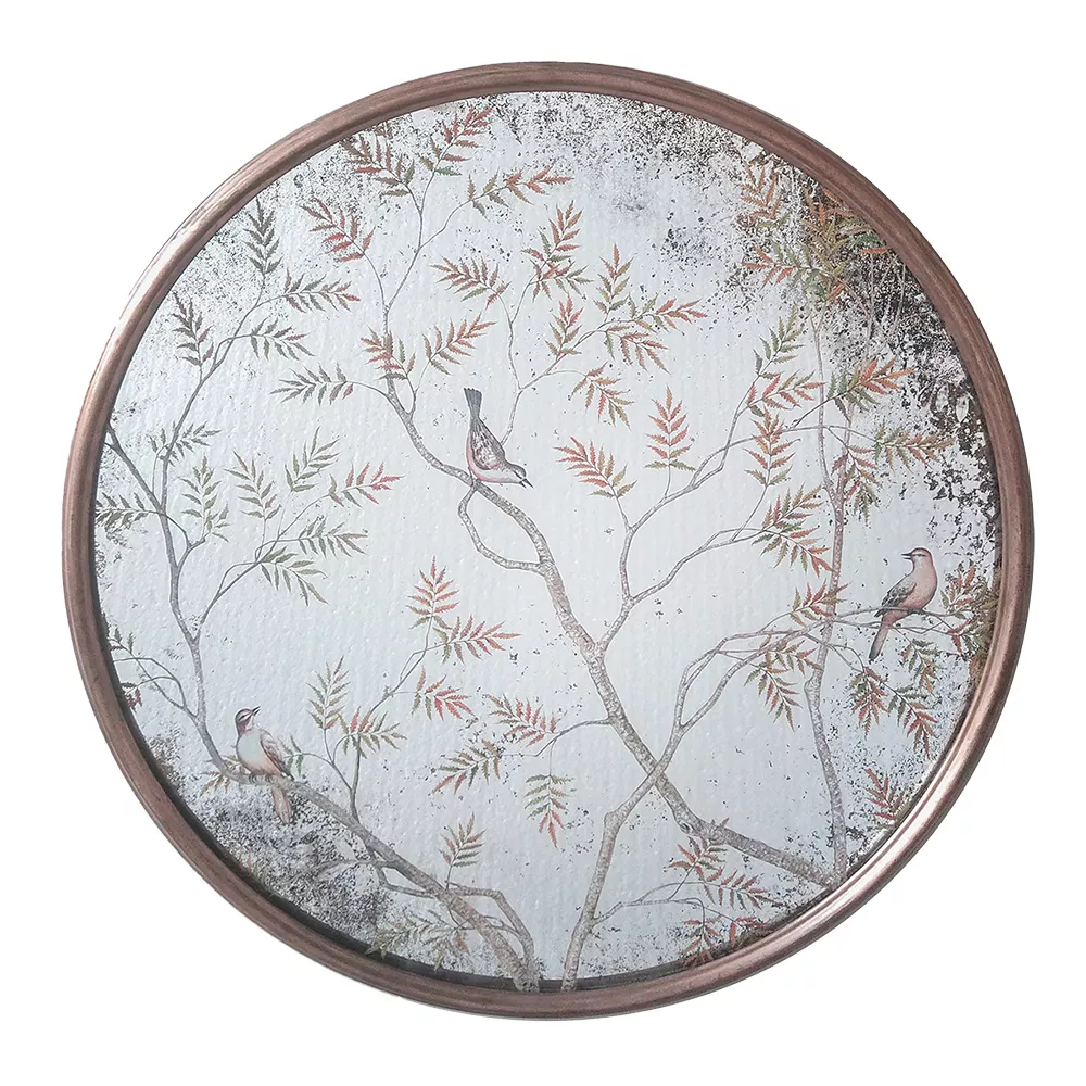 Vneste do svého interiéru nádech elegance a přírody s tímto unikátním dekorativním nástěnným zrcadlem. Zrcadlo je zasazeno do měděného kovového rámu, který dodává prostoru teplý a sofistikovaný vzhled. Povrch zrcadla je zdoben jemným potiskem listů a půvabného ptáčka, což vytváří harmonický a klidný motiv, který oživí každý pokoj.