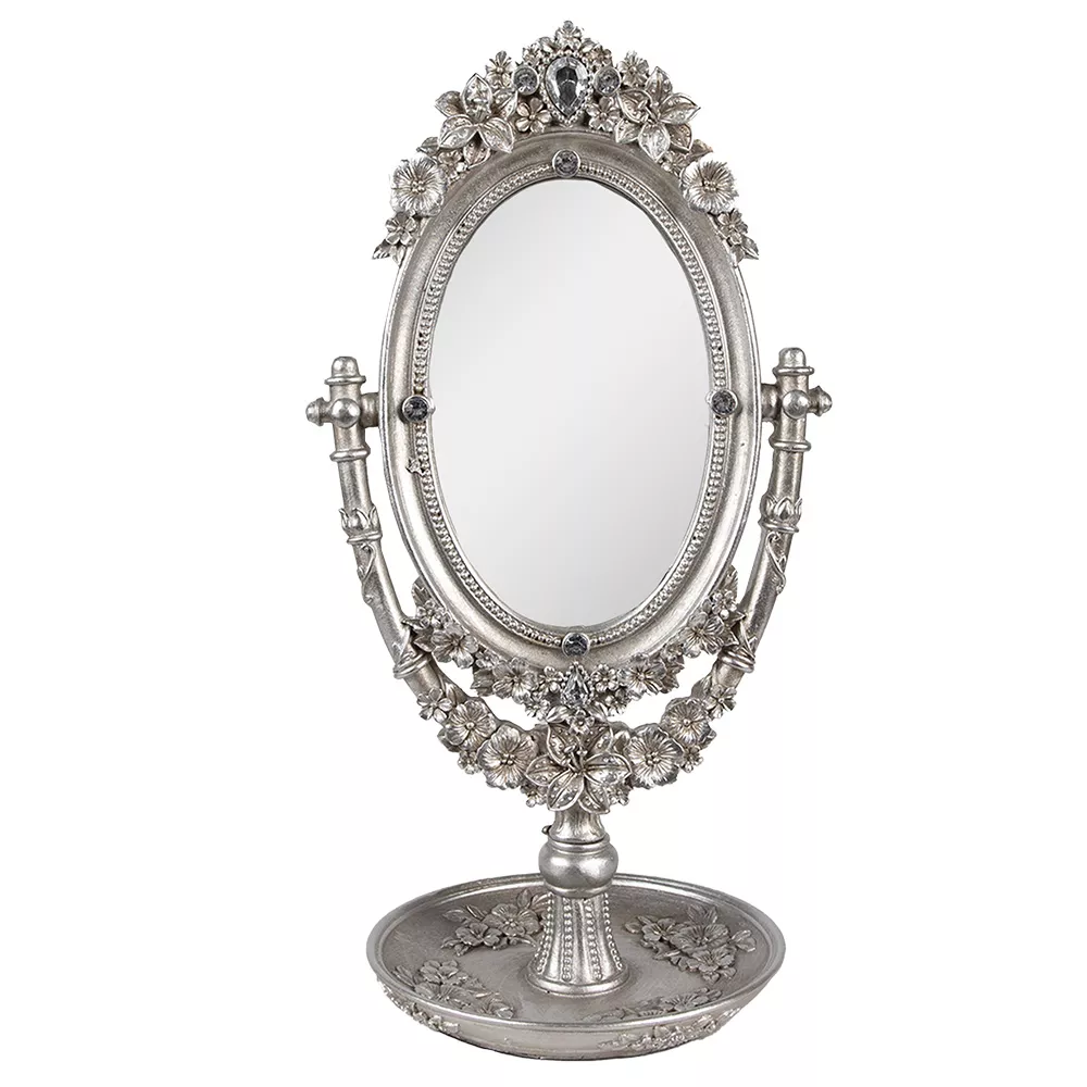 Bohatě zdobené stolní zrcadlo ve stříbrné barvě, vyrobené z polyrezinu. Ozdobí každou místnost, ve které se potřebujete krášlit.
