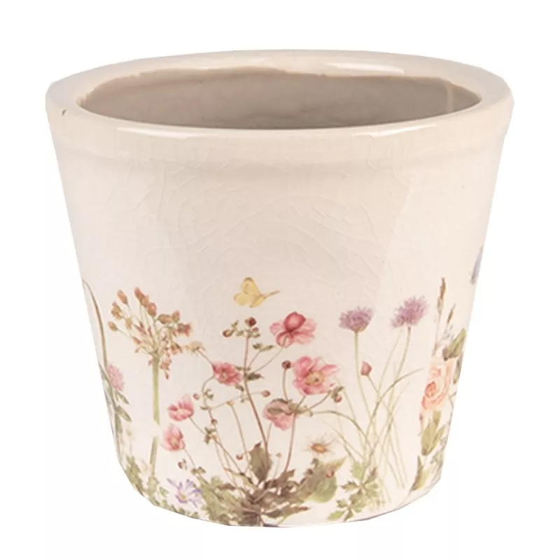 Krásný do interiéru, ale v létě i do exteriéru, dekorativní béžový keramický květináč ve venkovském stylu, ze série BLOOMING SPRING, s barevným motivem květin a motýlů. Otvor v horní části má Ø 10 cm. Tento květináč je součástí série.