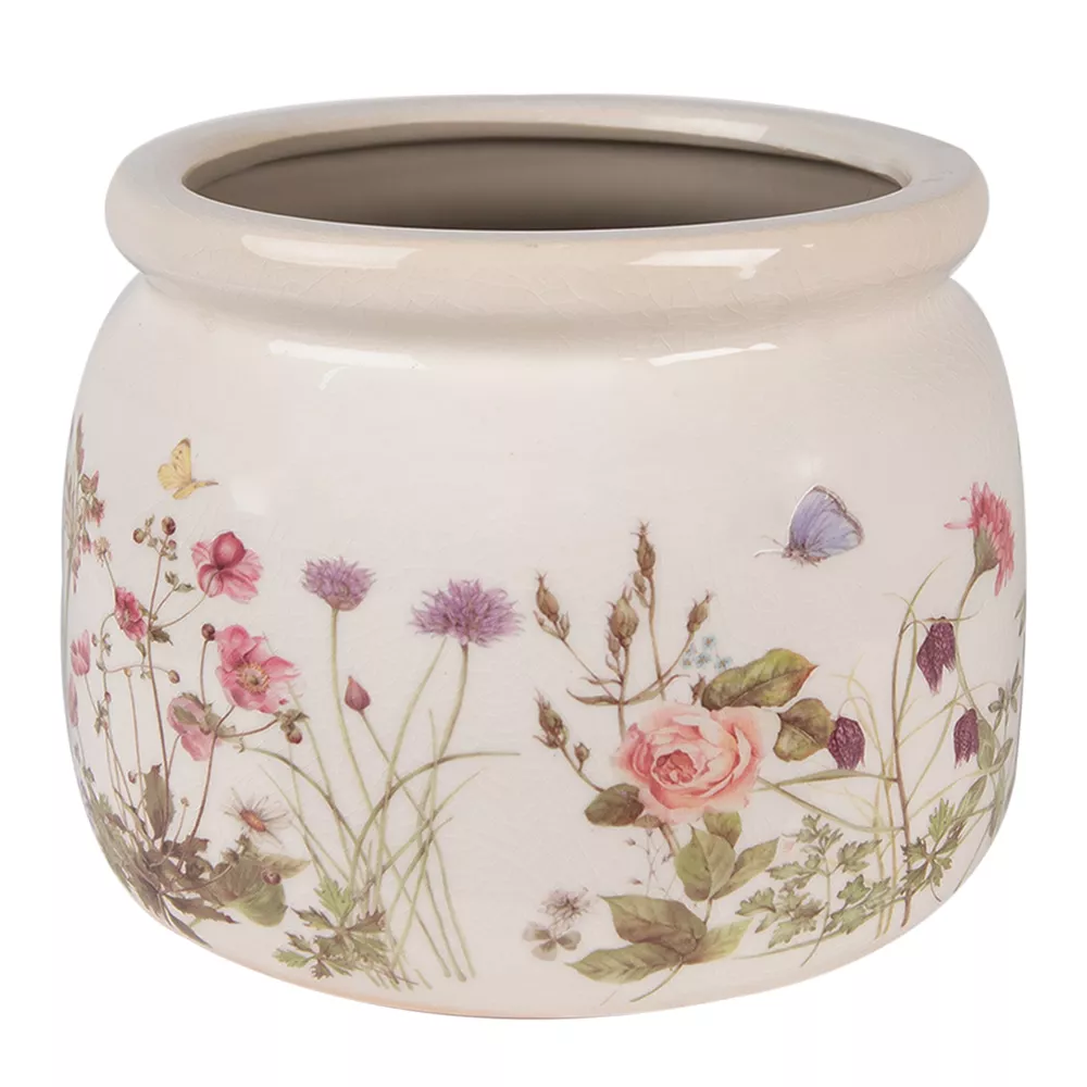 Krásný dekorativní keramický květináč v béžové barvě s barevným motivem růžových květů ve venkovském stylu. Tento květináč je součástí série a je k dispozici v různých velikostech. Průměr otvoru květináče 14 cm. Hloubka květináče 14 cm.