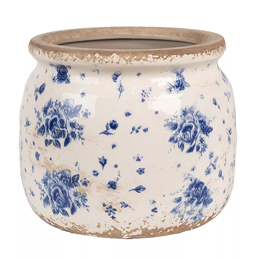 Krásný dekorativní béžový keramický květináč s barevným motivem modrých květů ve venkovském stylu. Tento květináč je součástí série a je k dispozici v různých velikostech.