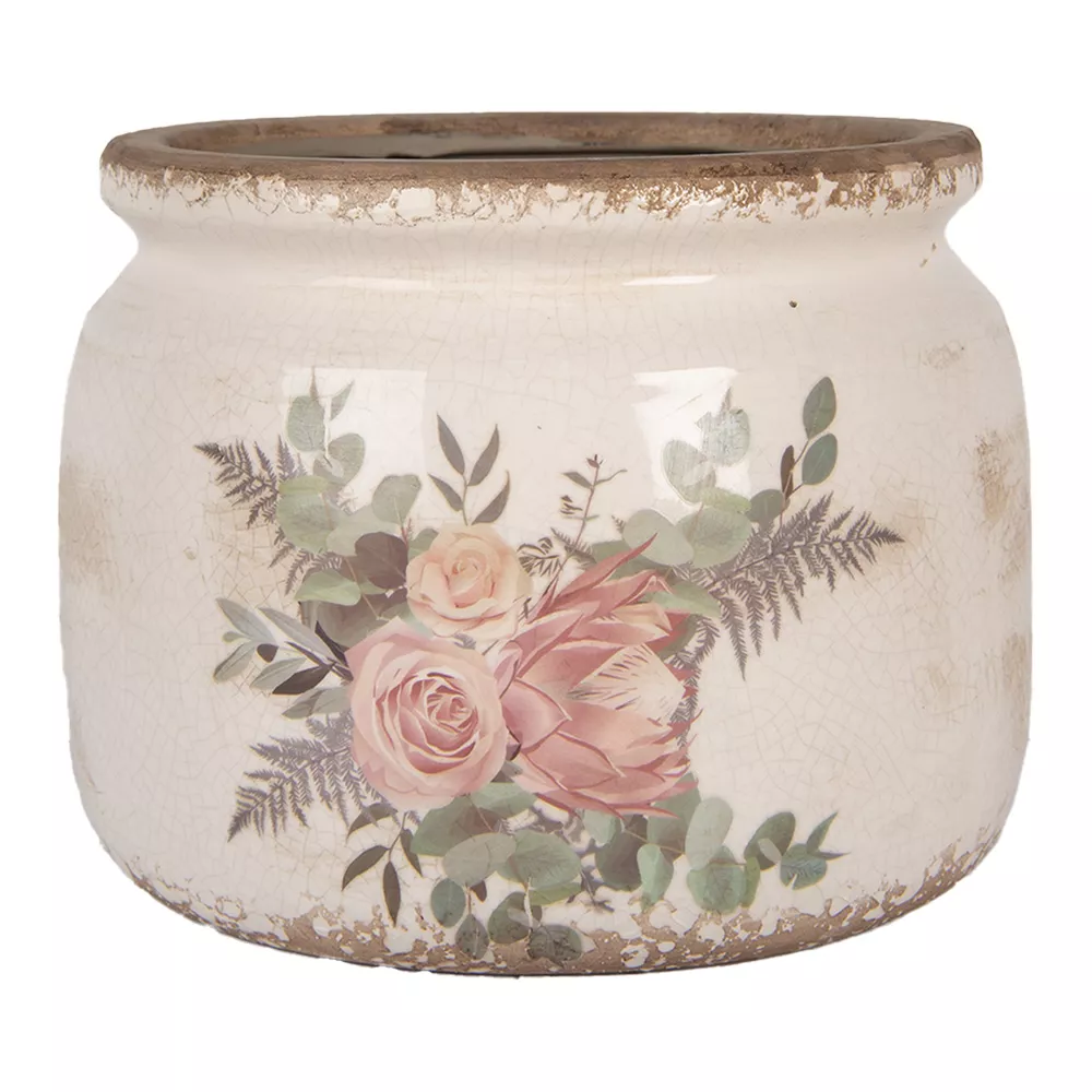 Dekorativní, krásný béžový keramický květináč s barevným vzorem růžových květů v rustikálním stylu. Krásná dekorace na každý okenní parapet.
