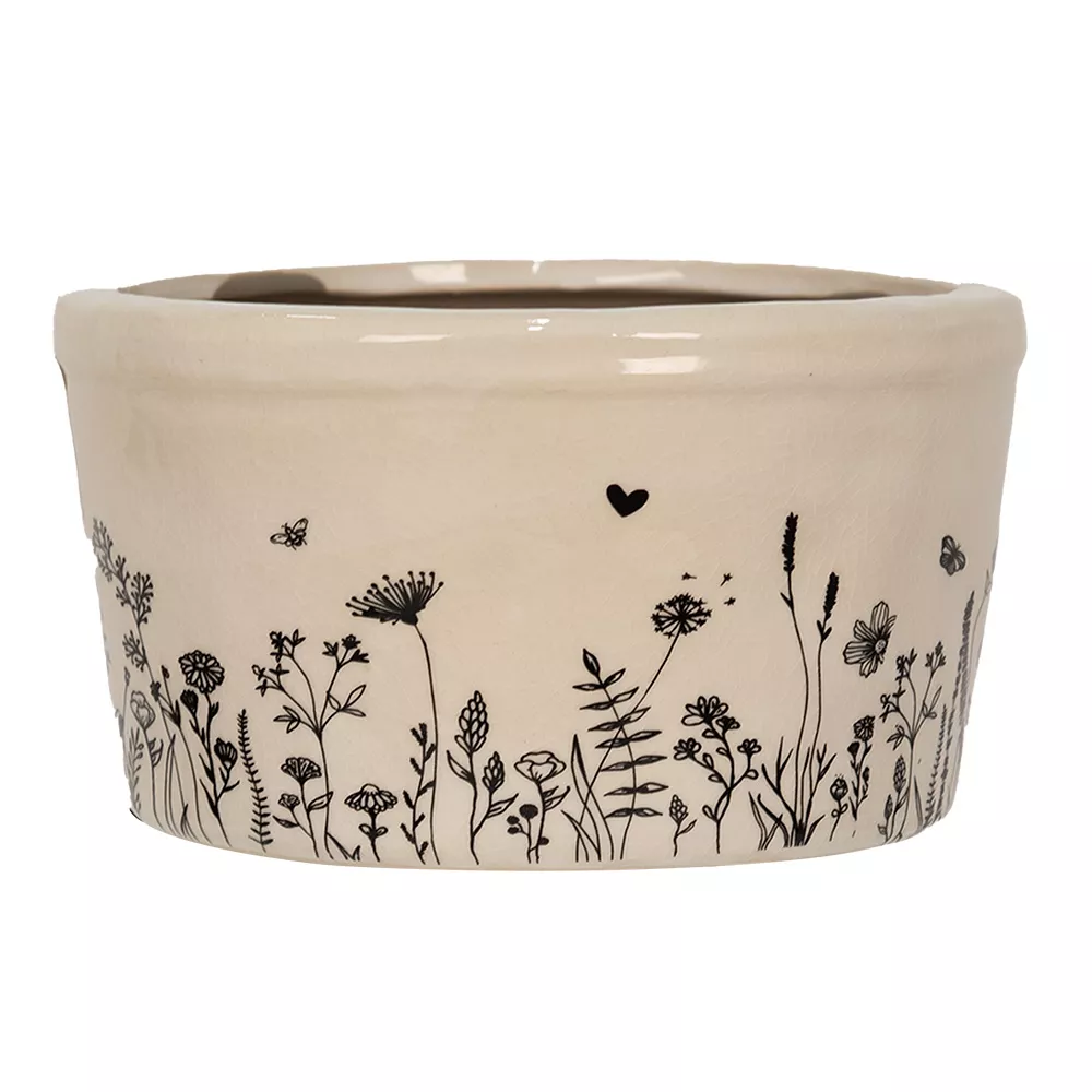 Dekorativní béžový keramický květináč s motivem černých květin. Květináč je součástí série FLORA AND FAUNA. Užijte si flóru a faunu s jejími květinami a včelami.