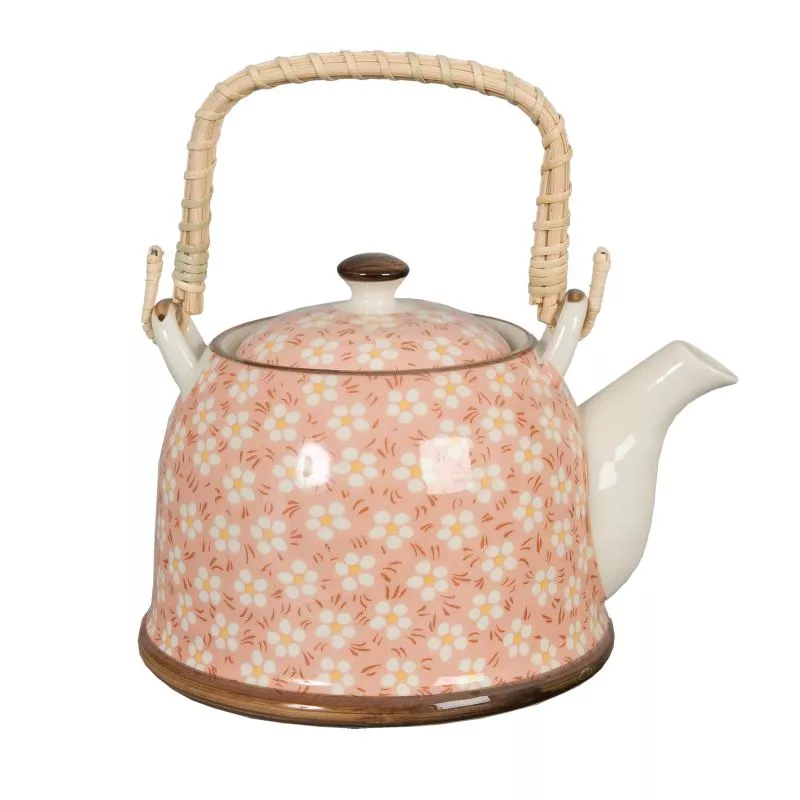 Půvabná keramická konvička na čaj s květinovým vzorem, ucho z drátu a ratanu. Součástí je sítko na čaj, které se vkládá pod víčko. Objem konvičky je 700 ml. Konvičku doplňte kalíšky se stejným motivem a pozvěte přátele na čajový dýchánek.