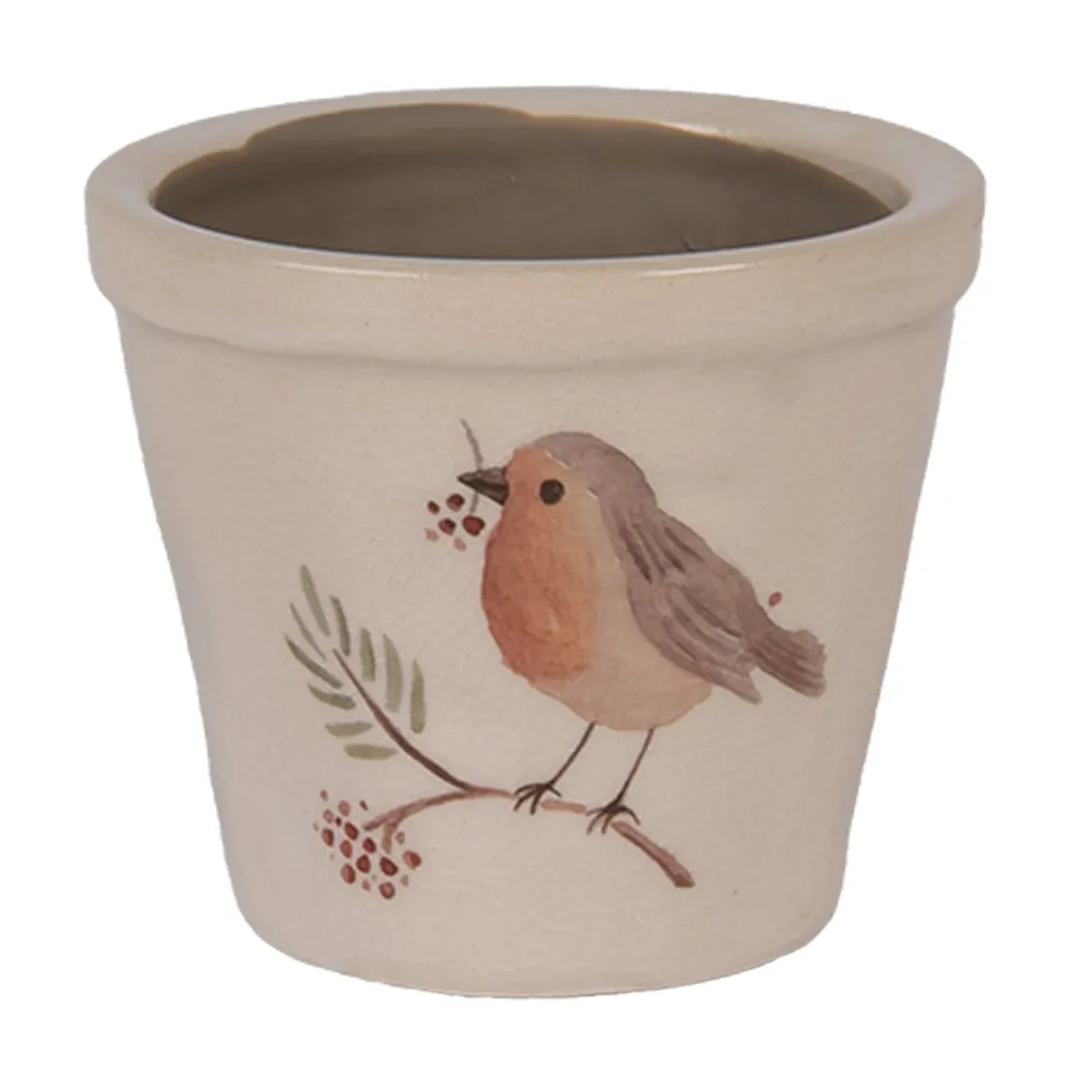 Dekorativní béžový keramický květináč s motivem ptáčka ze série VINTAGE GREEN PINE. Okouzlující doplněk na každý okenní parapet. Průměr otvoru je 7 cm.