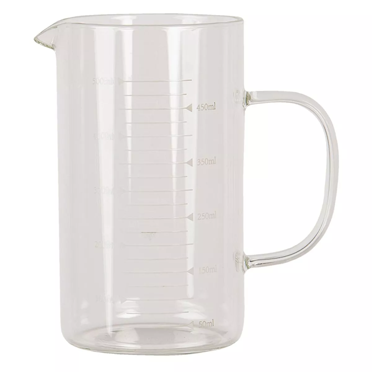 Skleněná transparentní odměrka na tekutiny o objemu 500 ml, s praktickou výlevkou a uchem.