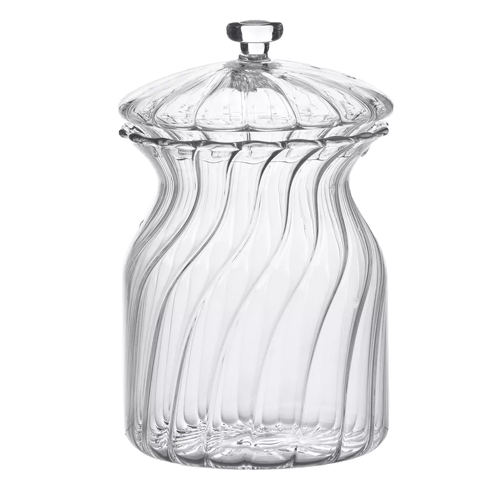 Dekorativní skleněná dózička s víčkem v retro stylu. Hodí se na cukrovinky, ale i šperky, klíče a jiné drobnosti.
