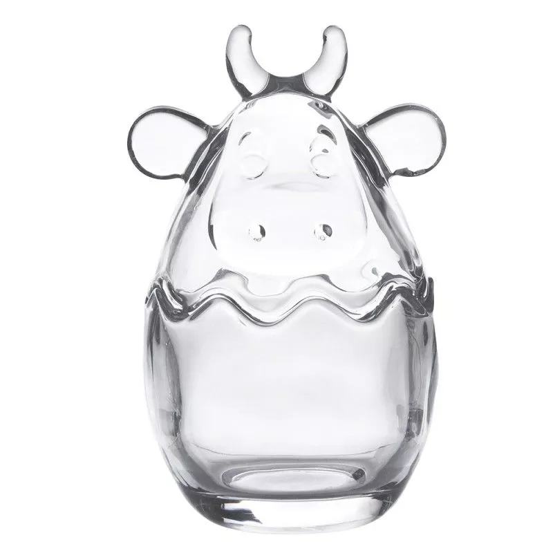 Pěkná skleněná dózička s poklopem ve tvaru kravské hlavy. Dózička je vhodná na skladování cukrovinek, bonbonů nebo velikonočního vajíčka.