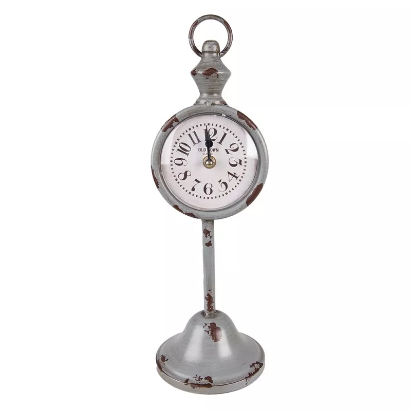 Krásné šedé, patinované kovové stolní hodiny ve venkovském stylu s bílým ciferníkem. Ciferník má Ø 10 cm a funguje na 1x AA.