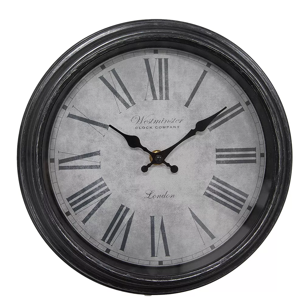 Dekorativní nástěnné hodiny v černo-šedé barvě, vyrobené z plastu a skla, ve venkovském stylu. Fungují na baterii 1xAA (není součástí dodávky). Snadno se zavěšují pomocí 1 šroubu.