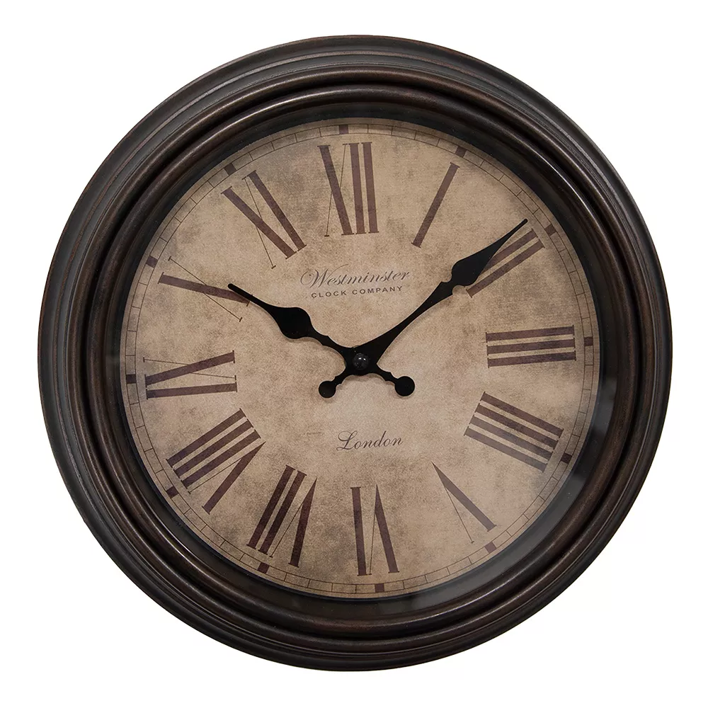 Dekorativní hnědé nástěnné hodiny z plastu a skla ve venkovském stylu. Fungují na baterii 1xAA (není součástí dodávky). Snadno se zavěšují pomocí 1 šroubu.