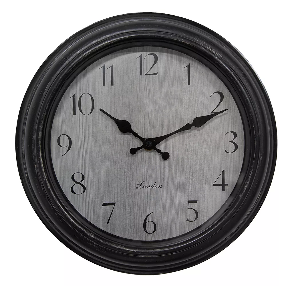 Dekorativní nástěnné hodiny v černo-šedé barvě, vyrobené z plastu a skla, ve venkovském stylu. Fungují na baterii 1xAA (není součástí dodávky). Snadno se zavěšují pomocí 1 šroubu.